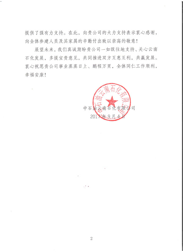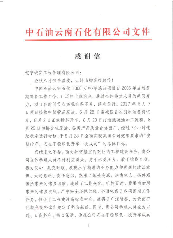 公司于今日收到由中國石油云南石化有限公司發給我方的《感謝信》一封,信中提到:對于我方所監理服務的煉油項目自2006年啟動籌備工作至今,我方監理人員不計利益得失,勇于承受壓力,使得該項目近日順利投產試車成功。對于我單位的工作給予極大的肯定以及衷心的感謝。對方還提到:希望雙方在日后的共同發展中,互惠互利,共贏發展。