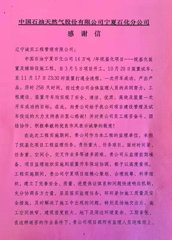 信中,中國(guó)石油天然氣股份有限公司寧夏石化分公司對(duì)我公司及項(xiàng)目監(jiān)理人員的工作十分滿意,給予了很高的評(píng)價(jià)與肯定,并表示衷心的感謝。