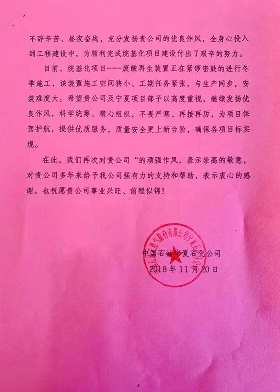 2018年11月20日,我公司收到了一封來(lái)自業(yè)主——中國(guó)石油天然氣股份有限公司寧夏石化分公司的感謝信。