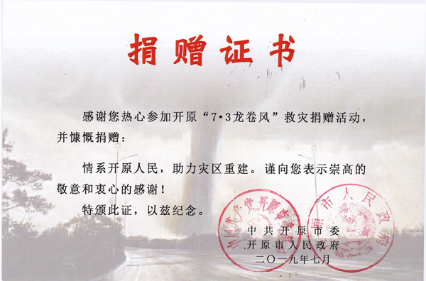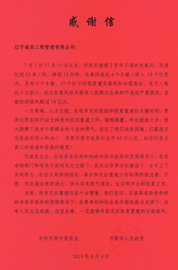 2019年7月3日一場可怕的龍卷風席卷了遼寧省開原市,據初步統計,這場災害共造成6人死亡、190余人受傷、2.8萬人受災,房屋受損6451戶,農業大棚受損25棟,農田受災14.6萬畝,100余萬平方米廠房遭受嚴重損壞,造成直接經濟損失約10.75萬元。災情發生后,省委、省政府及省住建廳領導高度重視,號召全省監理企業為此次災情捐款。龍卷風無情,人有情。為了幫助受災同胞共渡難關,我單位積極響應省委、省政府、省建設廳以及省協會的號召,在第一時間捐款3000元。參與此次捐款的省監理單位共計近30家,捐款數額從500元至20000元不等。事后,開原市委、開原市政府為我單位頒發了感謝信以及捐贈證書。