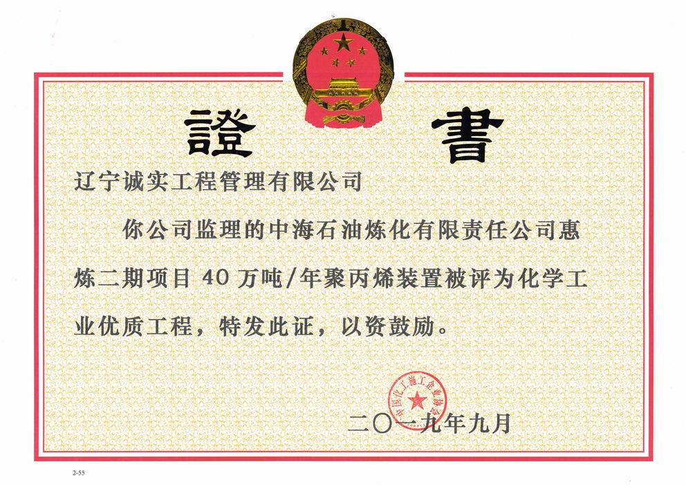 2019年9我單位所監理的“中海石油煉化有限責任公司惠煉二期項目40萬噸/年聚丙烯裝置”被評為化學工業優質工程獎
