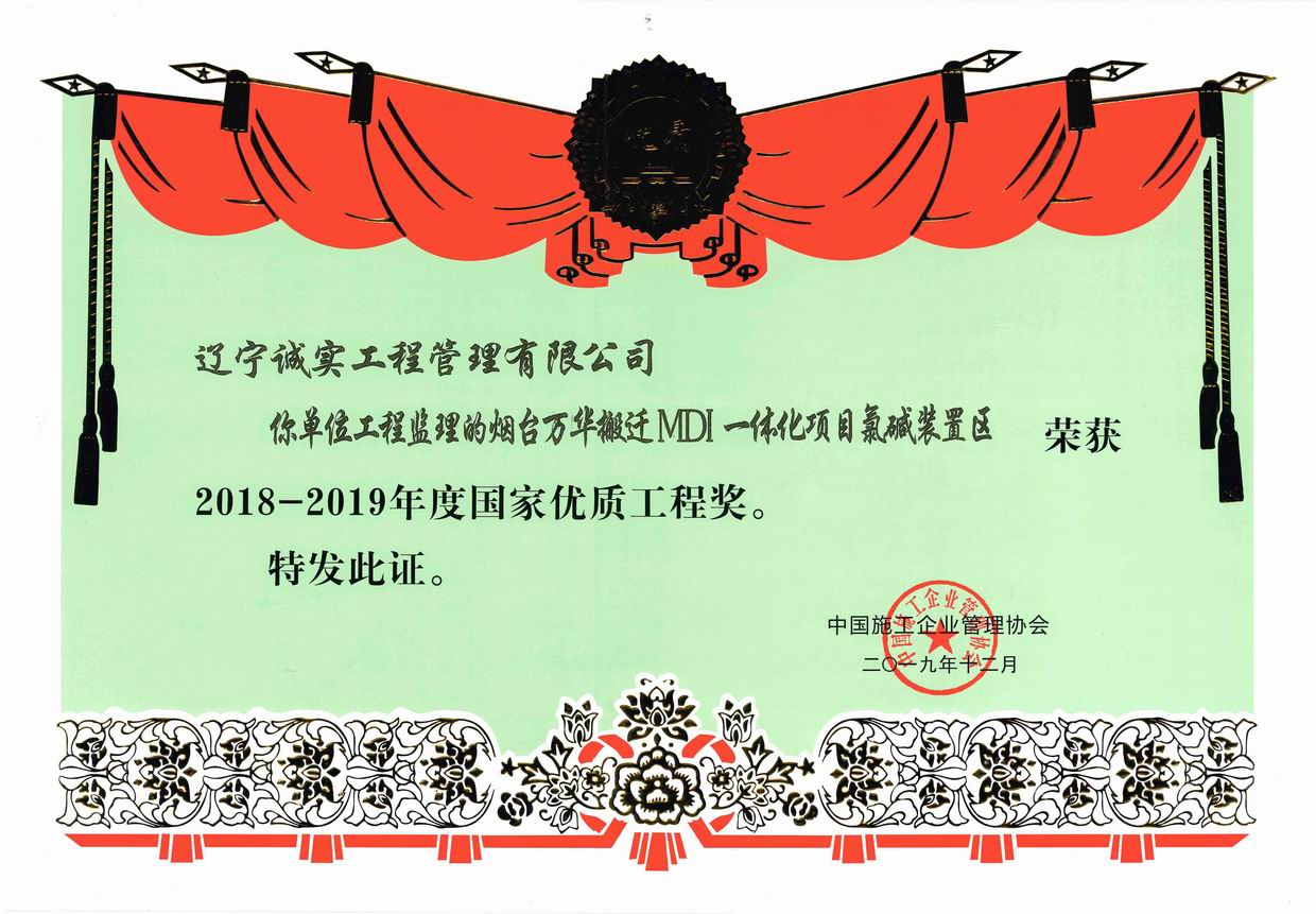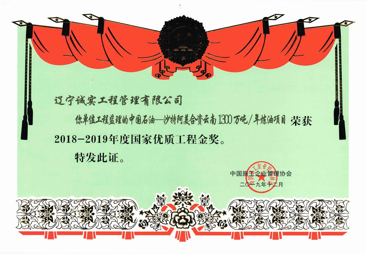 2019年12我單位所監理的“煙臺萬華搬遷MDI一體化項目氯堿裝置區”被評為2018-2019年度國家優質工程獎、“中國石油-沙特阿美合資云南1300萬噸/年煉油項目被評為2018-2019年度國家優質工程金獎。