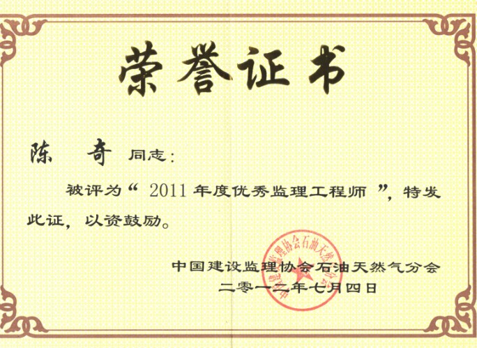 陳奇同志被中國建設監理協會評為年度優秀監理工程師